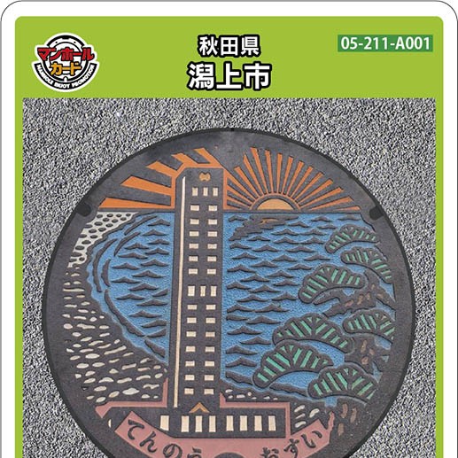潟上市(A001)のマンホールカード配布場所 道の駅 てんのう 秋田県潟上市天王字江川上谷地109-2 てんのうグリーンマーケット 配布時間 9:00~17:00 ただし、年末年始(12/31~1/3)は配布しない。 -