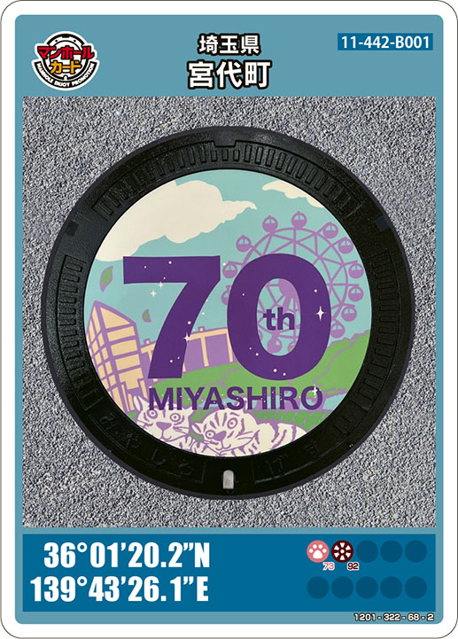 令和7年7月に宮代町が町制施行70周年を迎えるにあたって製作したマンホール蓋です。70周年を盛り上げるため、全国からロゴマークのデザイン公募を行いました。その中から宮代町の目指す「多くの人たちが町に訪れる歩きたくなるまち」のイメージに最もふさわしいものを採用しました。町内にある東武動物公園の観覧車や園内で令和6年11月に誕生したホワイトタイガーの赤ちゃん、町のシンボル的な建物であるコミュニティセンター進修館や田園風景を素材とした宮代らしく親しみやすいデザインです。緑豊かな宮代町を訪れる際は足元のマンホール蓋をお楽しみください。