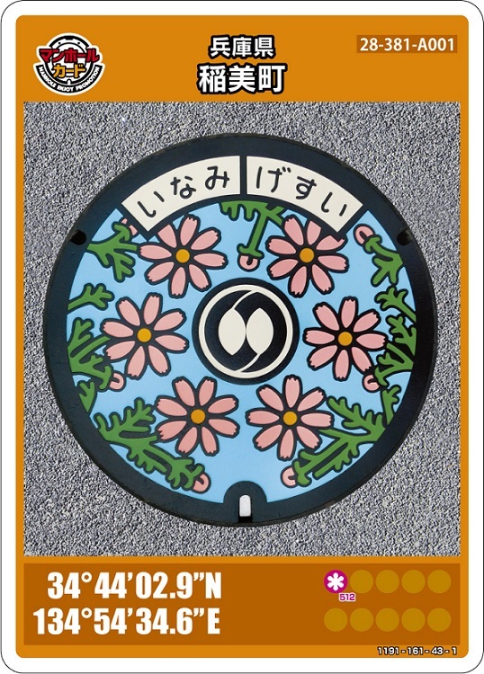 稲美町のマンホール蓋は、稲美町の「い」と「稲のもみ」を図案化した町章を中心に、その周りに町花の「コスモス」をバランスよくデザインしています。町内では年間を通じて彩り豊かな風景を楽しむことができ、特に雄大な田園風景の中で可憐なコスモスが咲き誇る景色は必見です。また稲美町は、四季の移ろいを感じられる地域として古くから歌人に愛されてきました。万葉集に稲美町を思わせる和歌が数多く詠まれており、その歌碑を当時の風景を再現した日本庭園「万葉の森」に設置し住民の憩いの場所として親しまれています。このマンホールカードは、町制施行70周年を記念して2025年から配布しています。